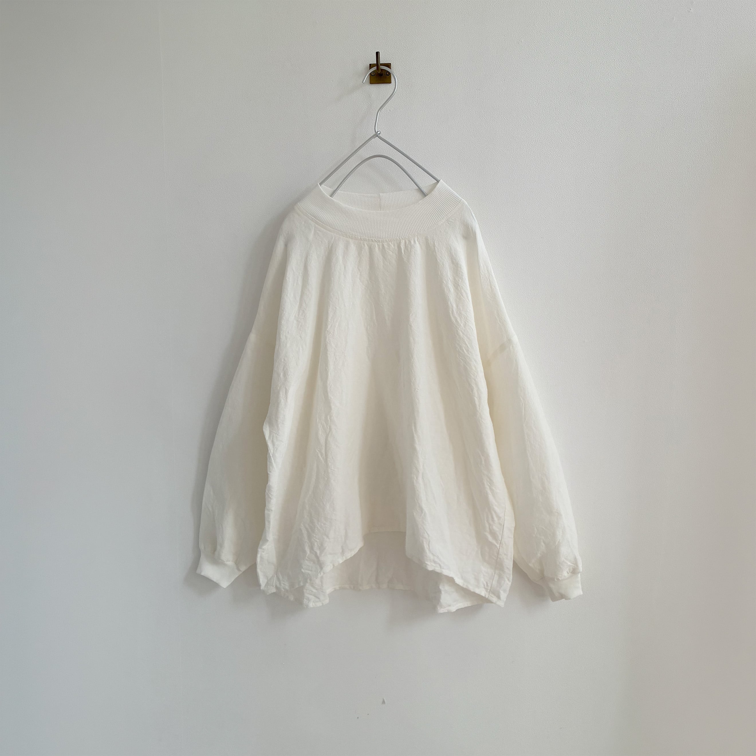 リネンの風合いが魅力のリネンプルオーバー。後ろ下がりのシンプルなプルオーバーになります。首元と袖口にオーガニックコットンリブを使用しています。